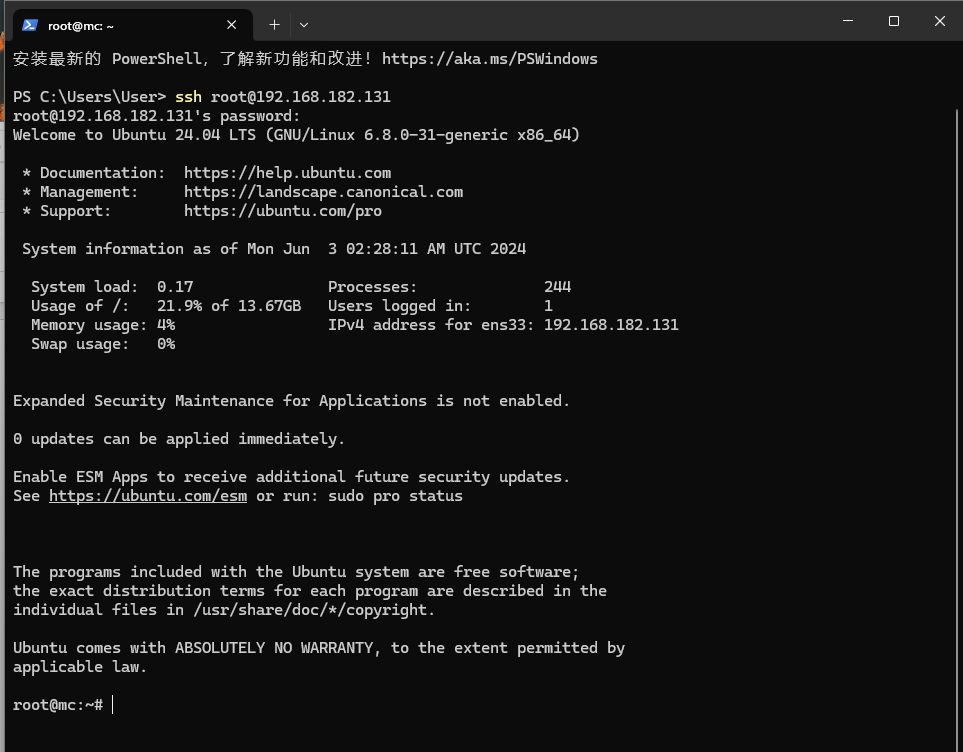 打开终端后,使用上文中提到的 ssh 命令即可连接到服务器。